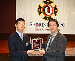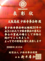 財団法人少林寺拳法連盟より30年の記念表彰■2008年1月12日(土) 大阪高校少林寺拳法部継続30年を記念して、財団法人少林寺拳法連盟より表彰されました。 初代・尾川主将、32代・岡田主将、指導部・沢良木さん、父兄会・立道さんが大阪高校少林寺拳法部を代表して授与式に出席していただきました。(表彰状は大阪高校武道館に飾っています。)