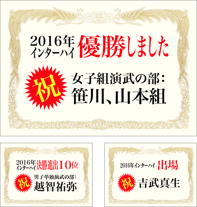 2016年7月29日~31日 岡山県美作市 武蔵武道館で行われたインターハイにおいて「女子組演武の部」で、みごとに優勝を果たしました!おめでとうございます。